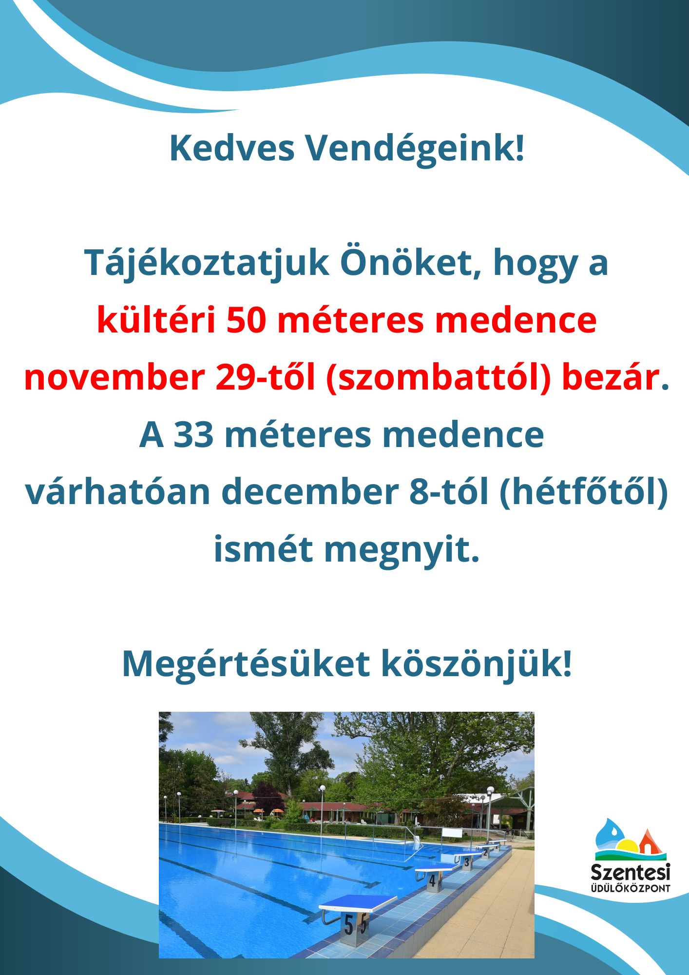 Ezúton tájékoztatjuk Önöket, hogy a kültéri 50 méteres medence november 29-től (szombattól) zárva tart.
