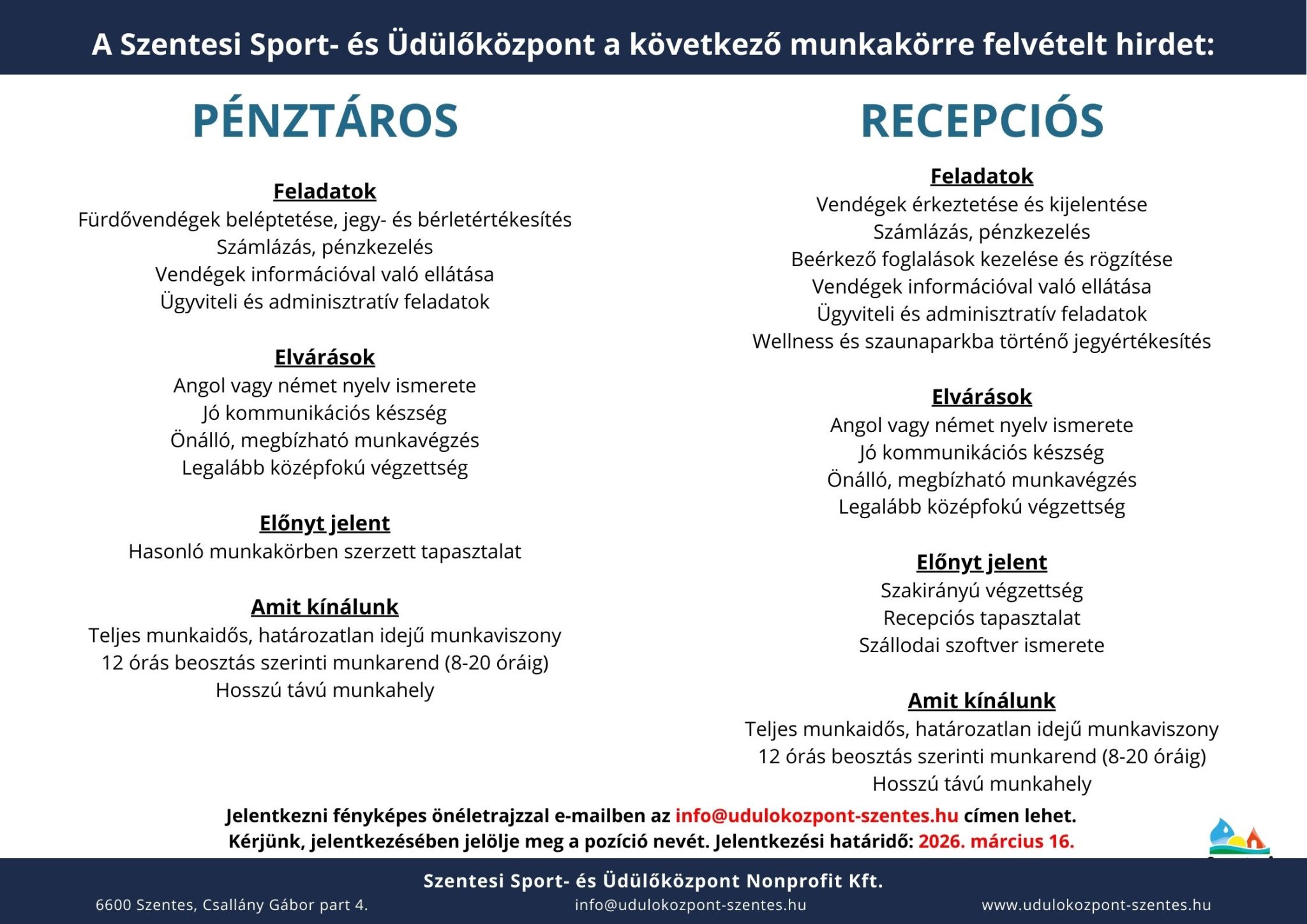 A Szentesi Sport- és Üdülőközpont csapatába a következő munkakörökre várjuk a jelentkezéseket: